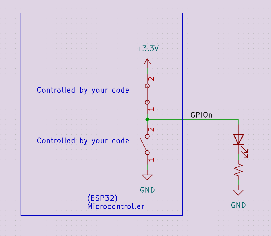 Inside microcontrollers are these amazing devices called mosfets. You may have heard of them, and they are remarkably small yet efficient switches that allow the microcontroller to control general-purpose outputs. Let’s look at how they drive an output pin. Here’s a typical GPIO (general purpose Input/Output pin) on a microcontroller.