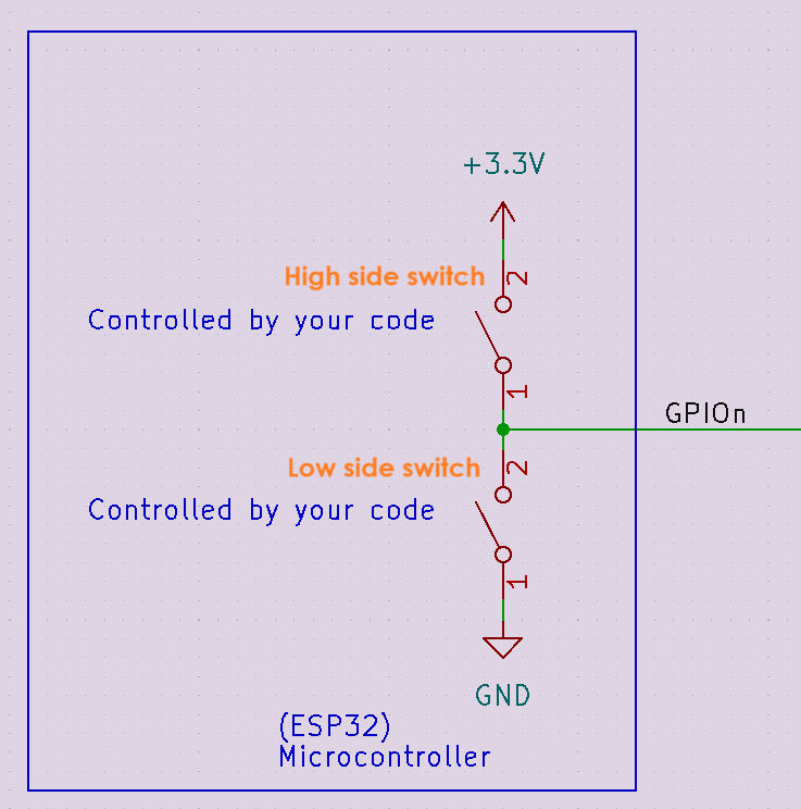 Inside microcontrollers are these amazing devices called mosfets. You may have heard of them, and they are remarkably small yet efficient switches that allow the microcontroller to control general-purpose outputs. Let’s look at how they drive an output pin. Here’s a typical GPIO (general purpose Input/Output pin) on a microcontroller.